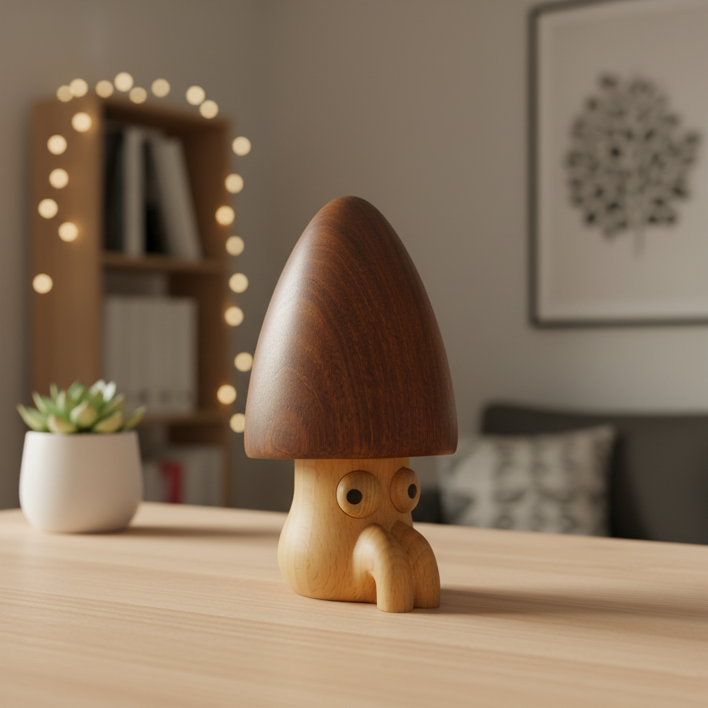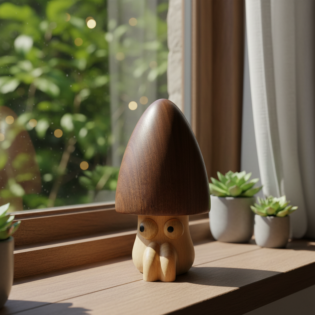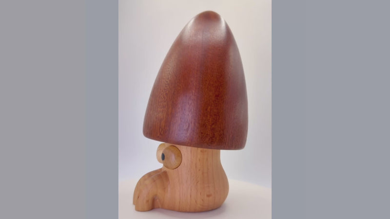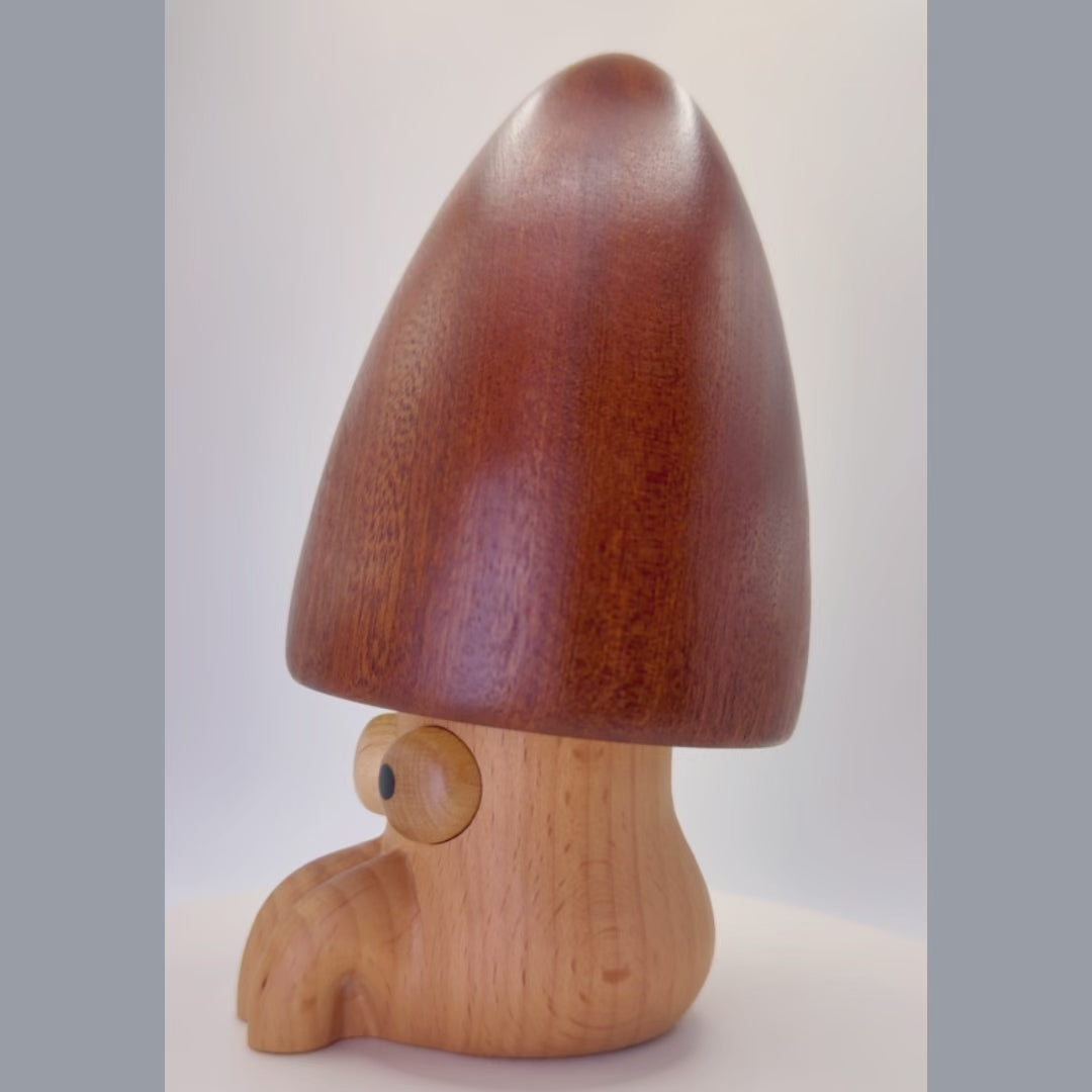 A playful wooden music box shaped like a pointed mushroom figure. With a tall cap, quirky eyes, and a comical long nose, this handcrafted piece adds humor and charm to any setting.