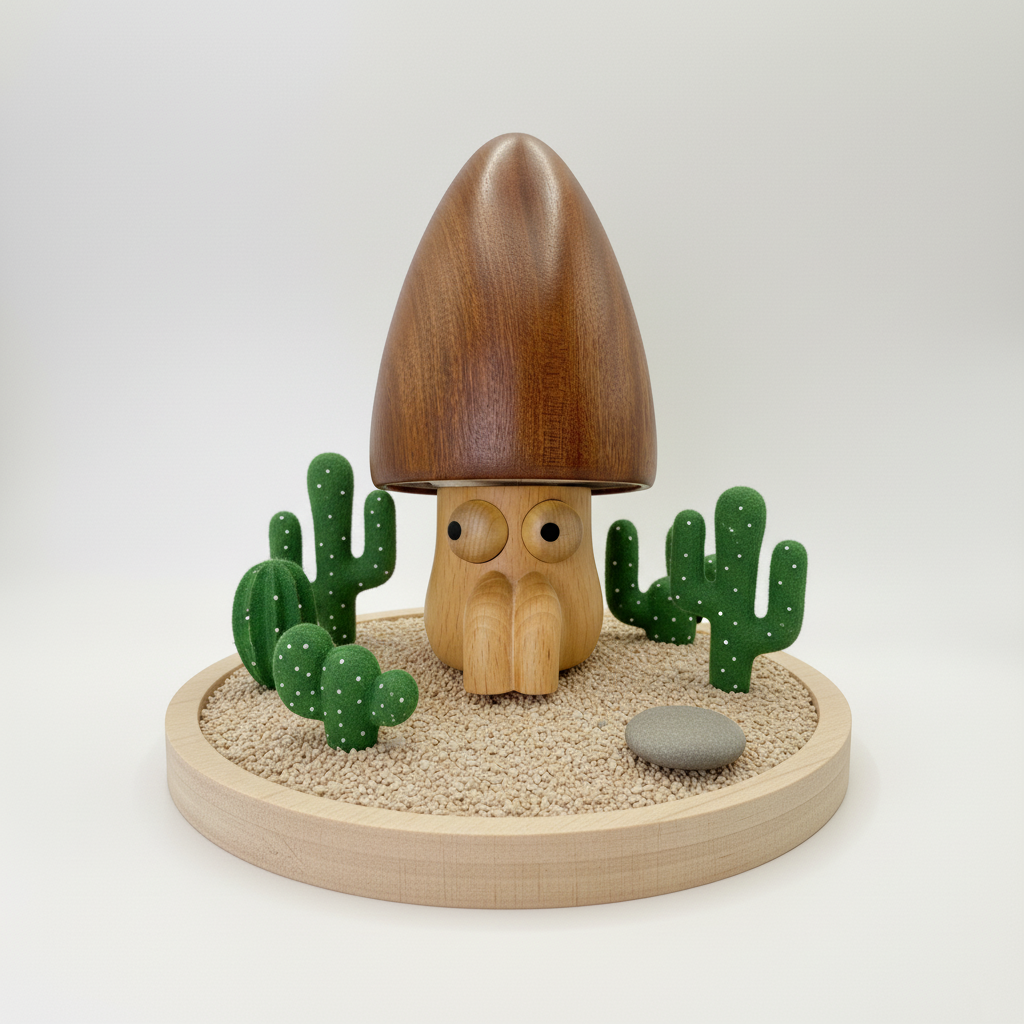Rotate the mushroom head to wind the movement—watch it spin as the melody Spirited Away plays with bright, clear tones. Its movable arms and legs make it as interactive as it is delightful, blending fine artistry with lighthearted fun.